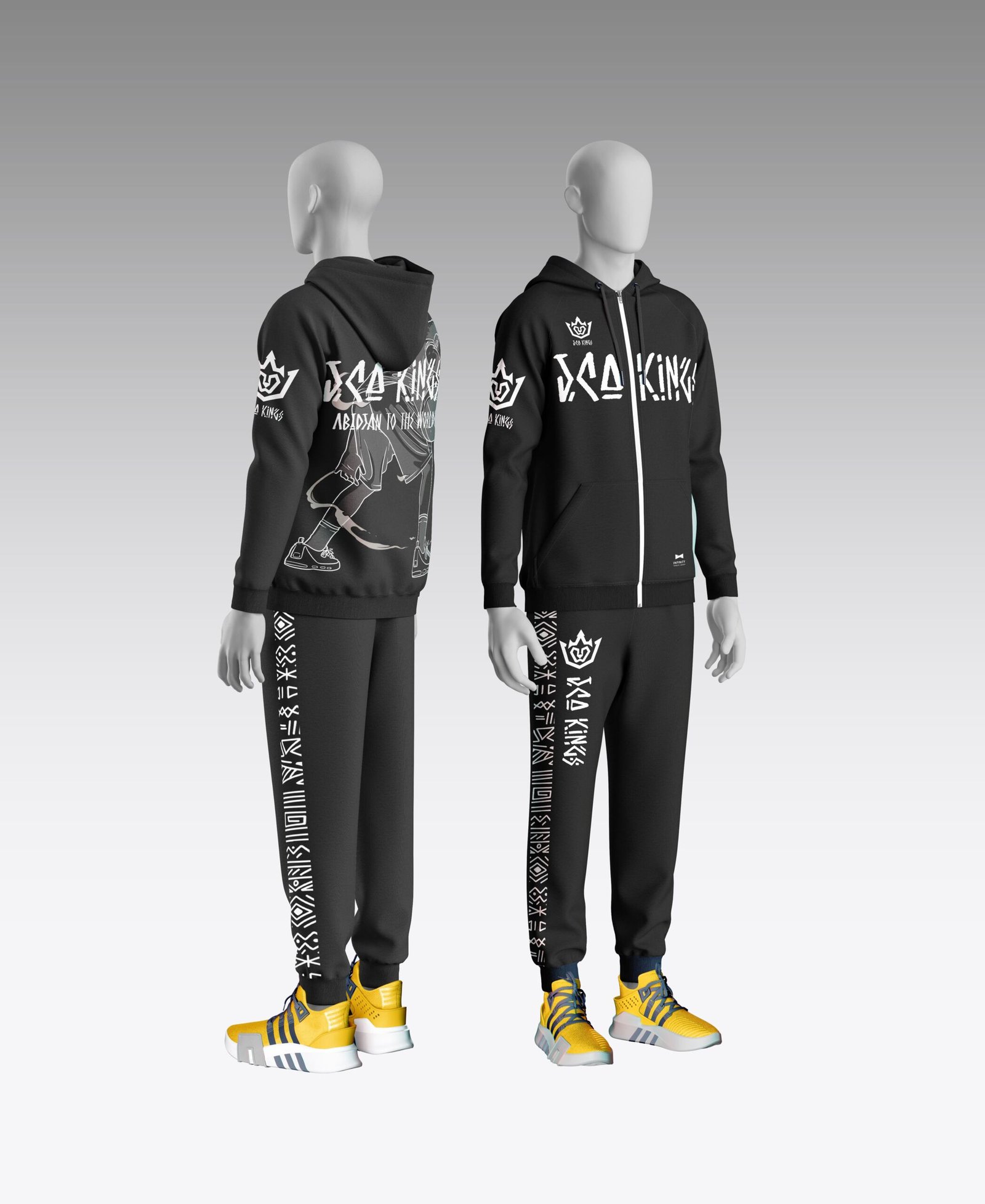 Le haut présente un design fort avec le logo couronne revisité sur la poitrine, accompagné de détails graphiques modernes. Les manches contrastées et les finitions soignées renforcent son allure premium. À l’arrière, des éléments verticaux inspirés de motifs africains ajoutent une touche culturelle distinctive.